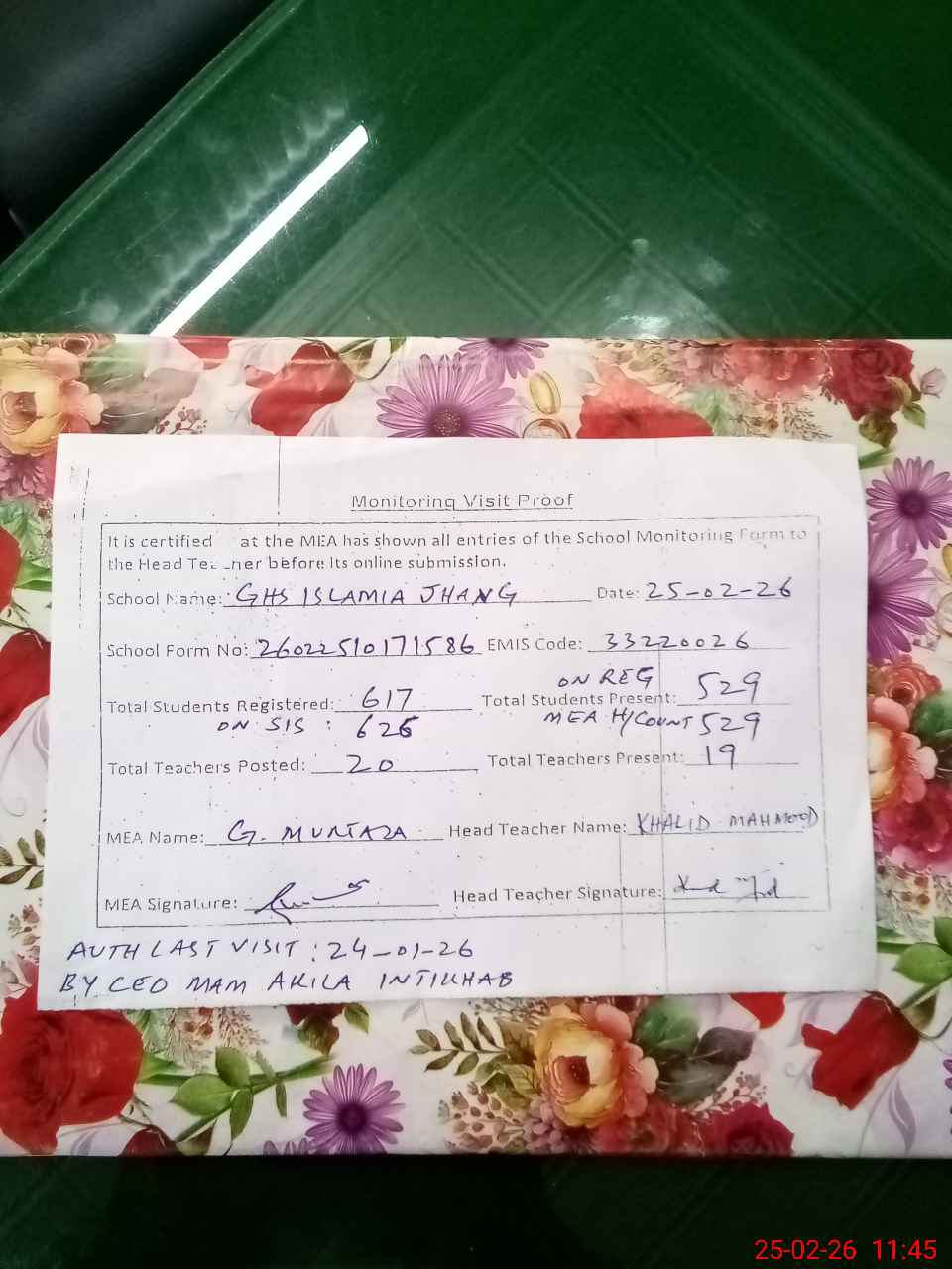 | EMIS Code: 33220026 | Name of School: GHS ISLAMIA JHANG | |||