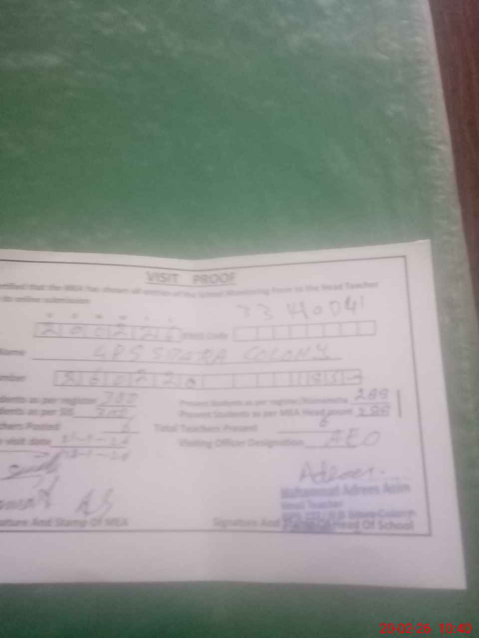 | Attendance Register | Head Teacher | MEA with School | Visit Proof |