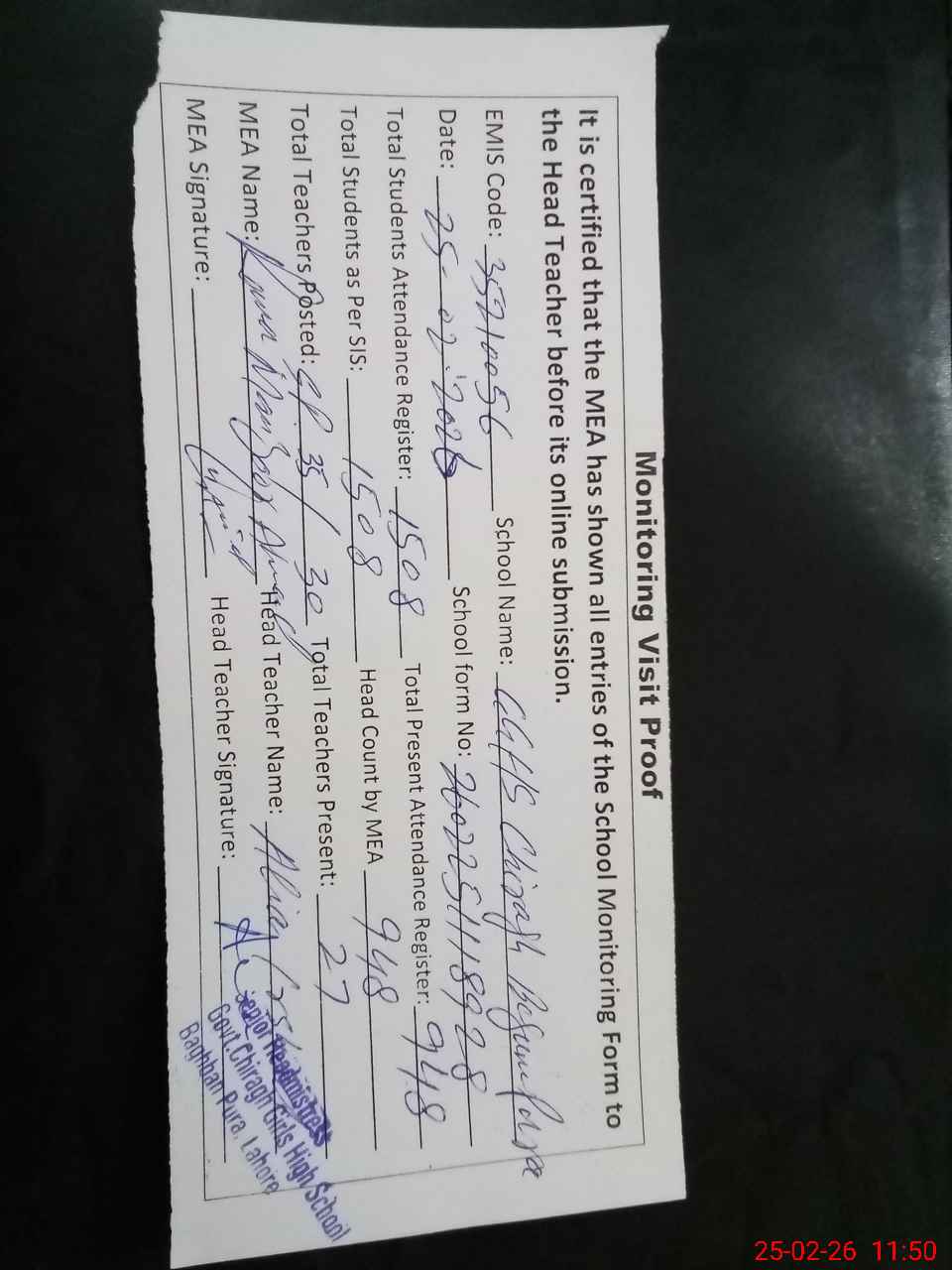 | Attendance Register | Head Teacher | MEA with School | Visit Proof |