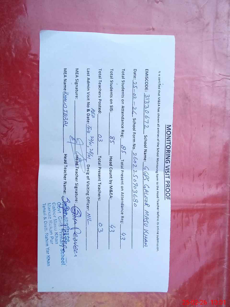 | EMIS Code: 31330672 | Name of School: GGPS GALOOR MASU KHAN | |||