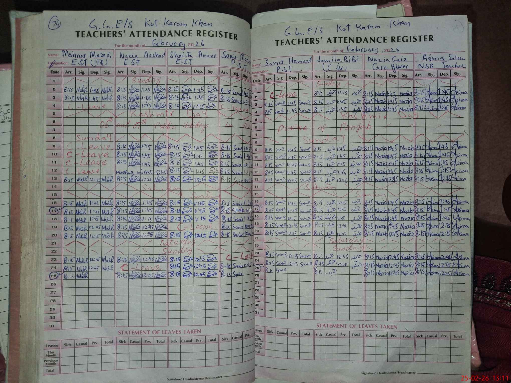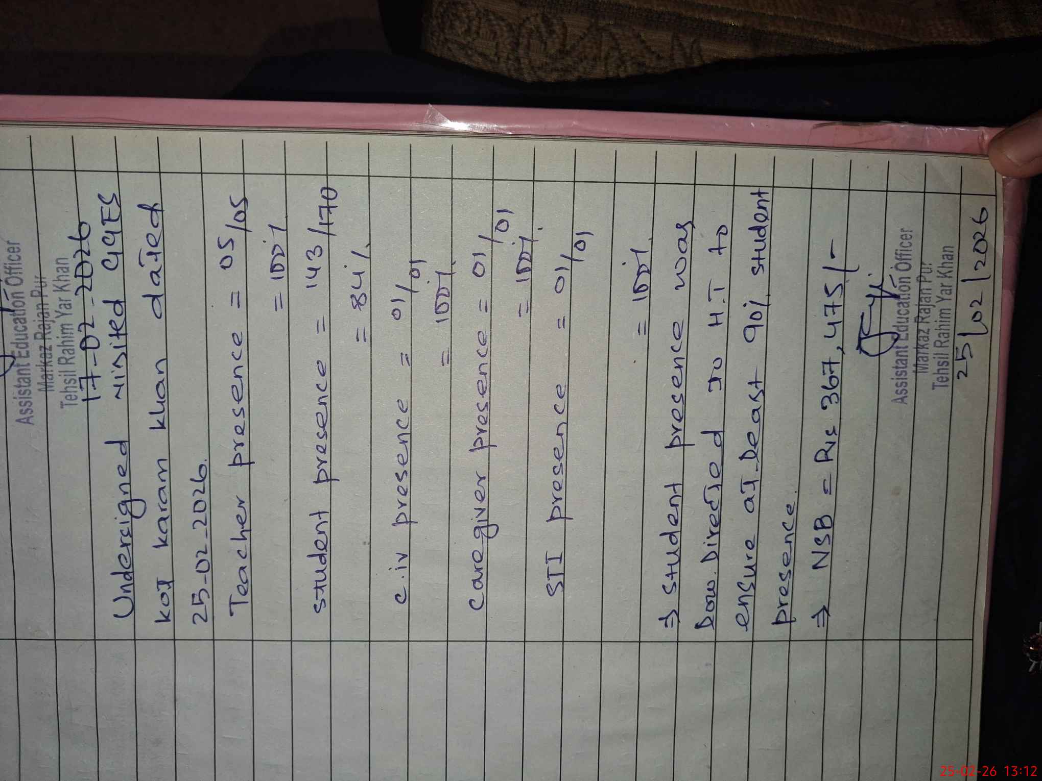 | Attendance Register | Head Teacher | MEA with School | Visit Proof |