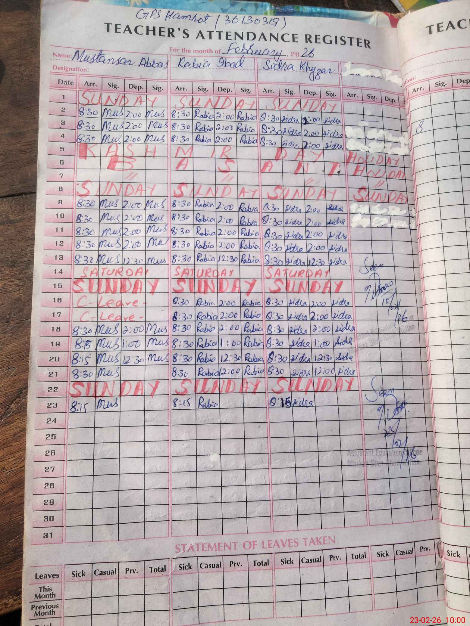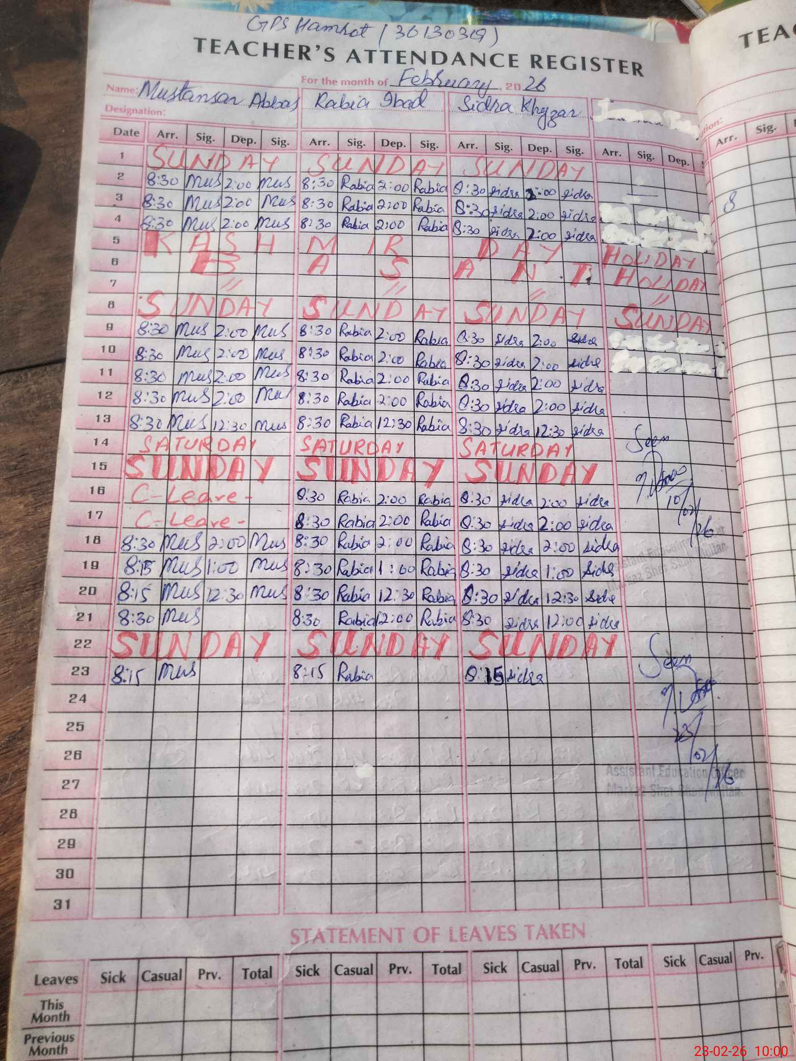 | Name: Mu**** Ab**** Designation: (School Headmaster's/Headmistress's) PST/PTC/JV Phone/Cell Number: 03**** |
