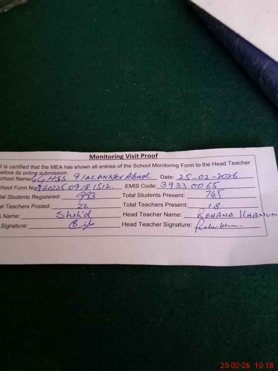 | Attendance Register | Head Teacher | MEA with School | Visit Proof |