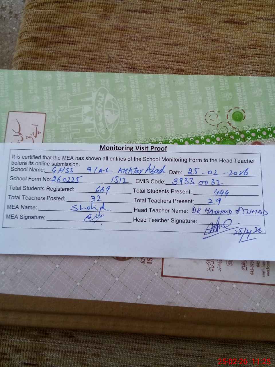 | Certified that this School was Inspected by the Undersigned MEA/DMO Today and the Information Stated Above is as Per Record. | |||||