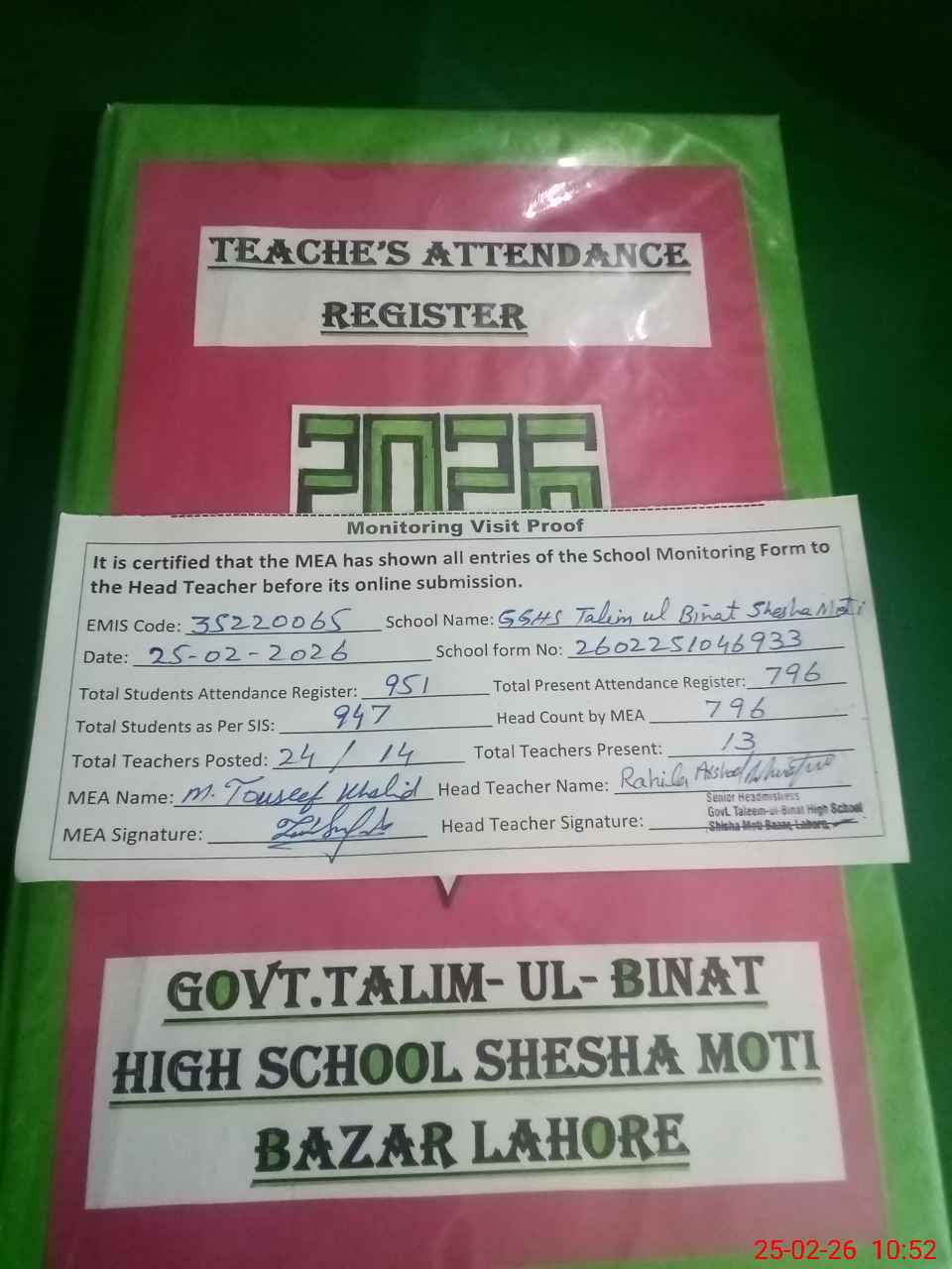 | EMIS Code: 35220065 | Name of School: GGHS TALIM UL BINAT SHESHA MOTI BAZAR LAHORE | |||