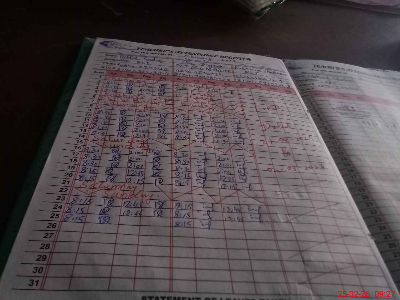 | CNIC | Full Name | Designation | R/C | Absence During Last Calender Month |
