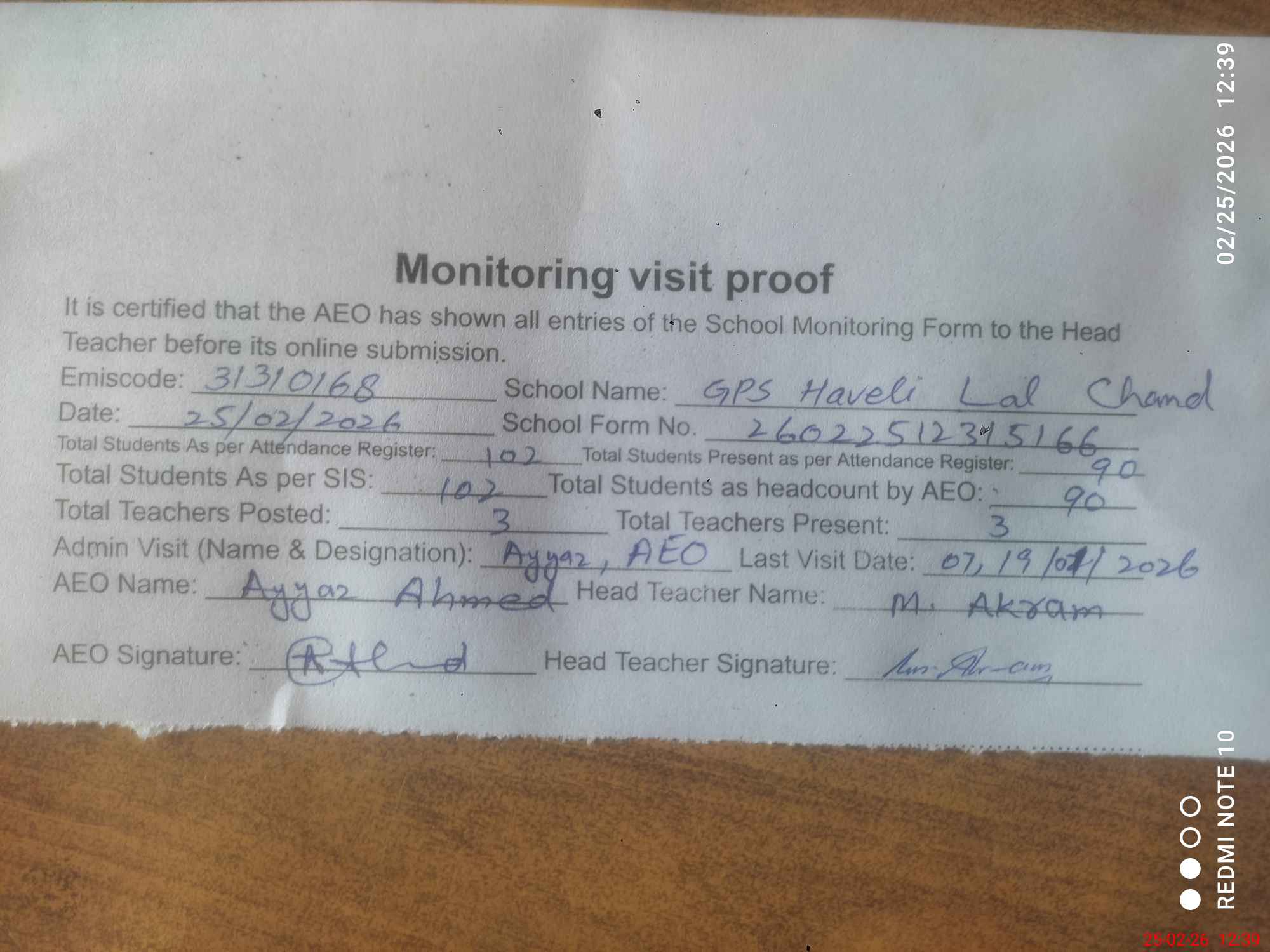 | Certified that this School was Inspected by the Undersigned MEA/DMO Today and the Information Stated Above is as Per Record. | |||||