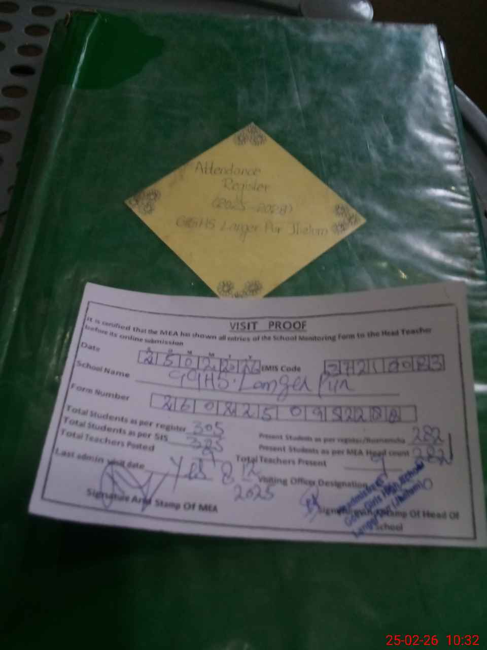 | Attendance Register | Head Teacher | MEA with School | Visit Proof |