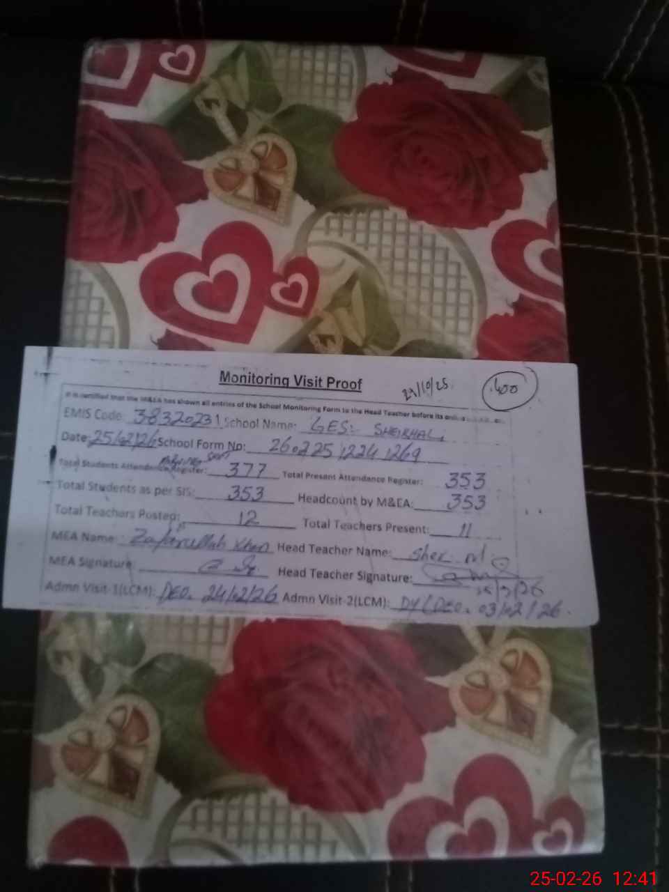 | Attendance Register | Head Teacher | MEA with School | Visit Proof |