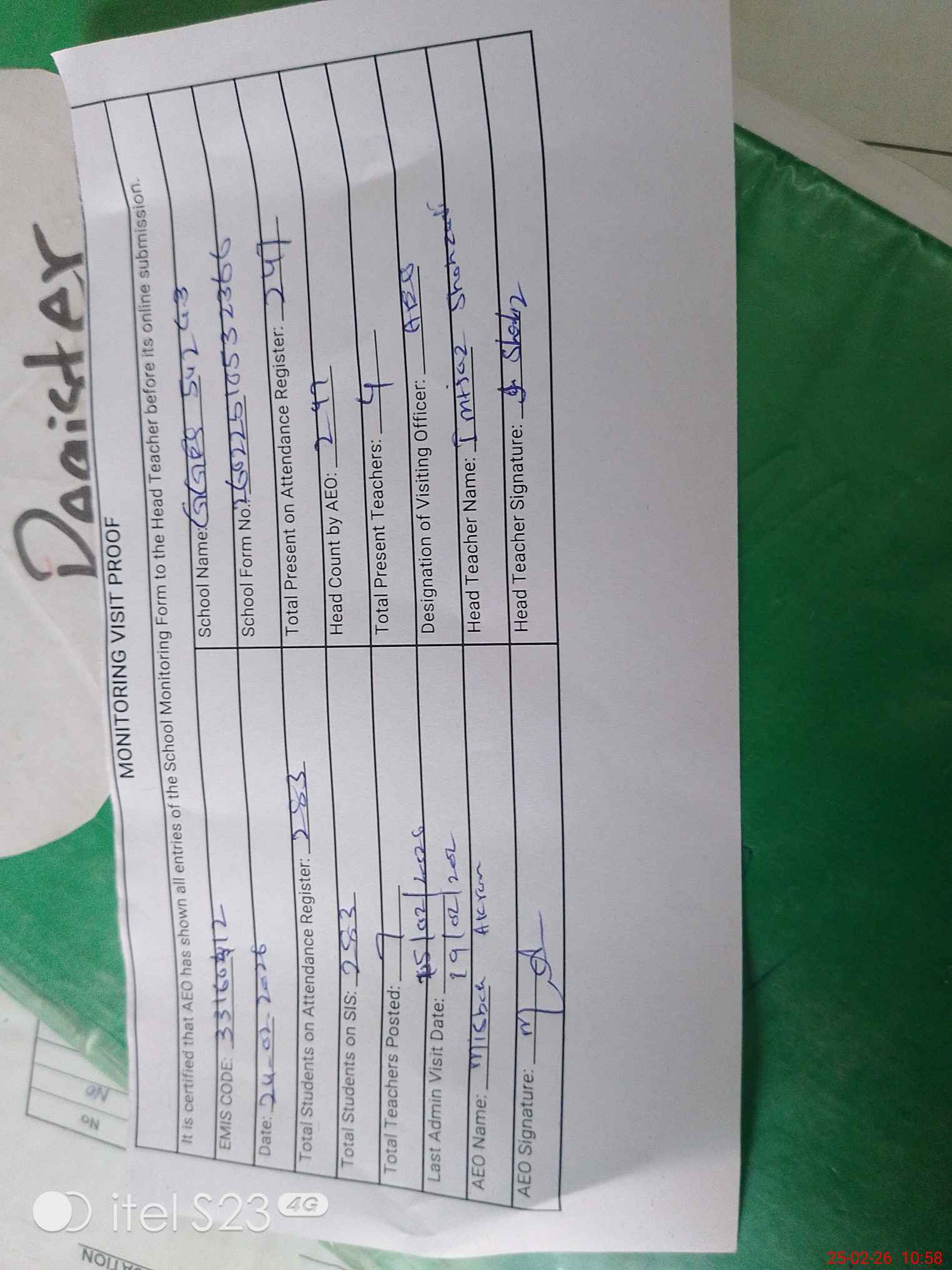 | Attendance Register | Head Teacher | MEA with School | Visit Proof |