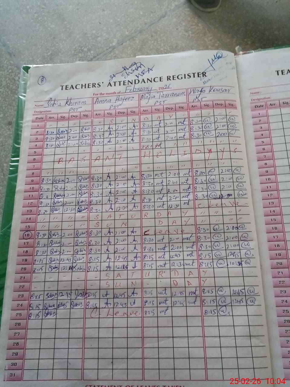 | Leave | Duty | Absent | Maternity | Medical | Ex- Pak |
