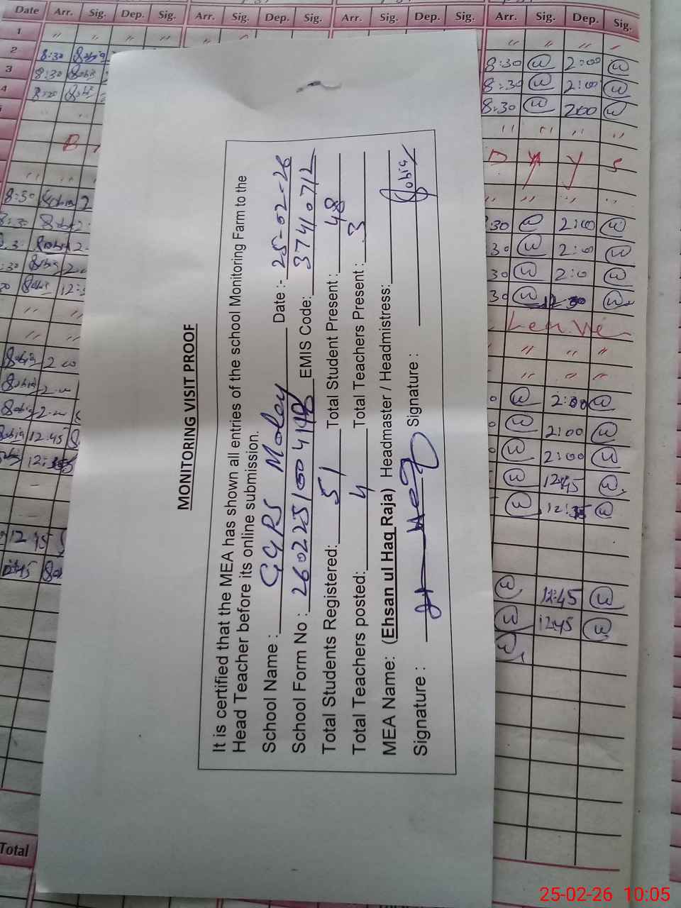 | Monitoring Date: 25-02-2026 | Start Time: 25-02-2026 09:38 AM | End Time: 25-02-2026 10:09 AM | Name of MEA: Eh**** UlHa**** Ra**** | |