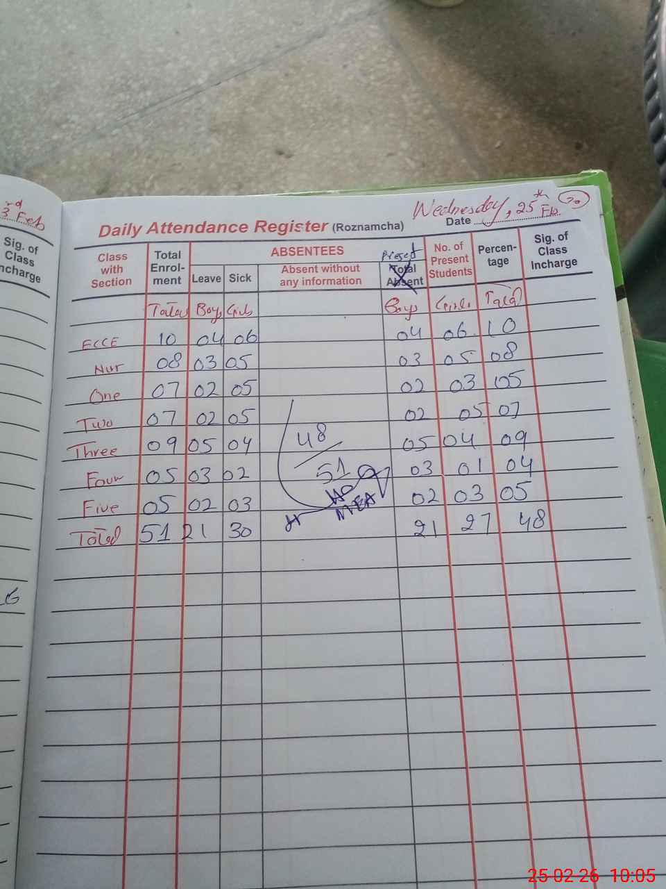| Total Students Present | 0 | 10 | 5 | 7 | 9 | 4 | 5 | 48 | ||||||||