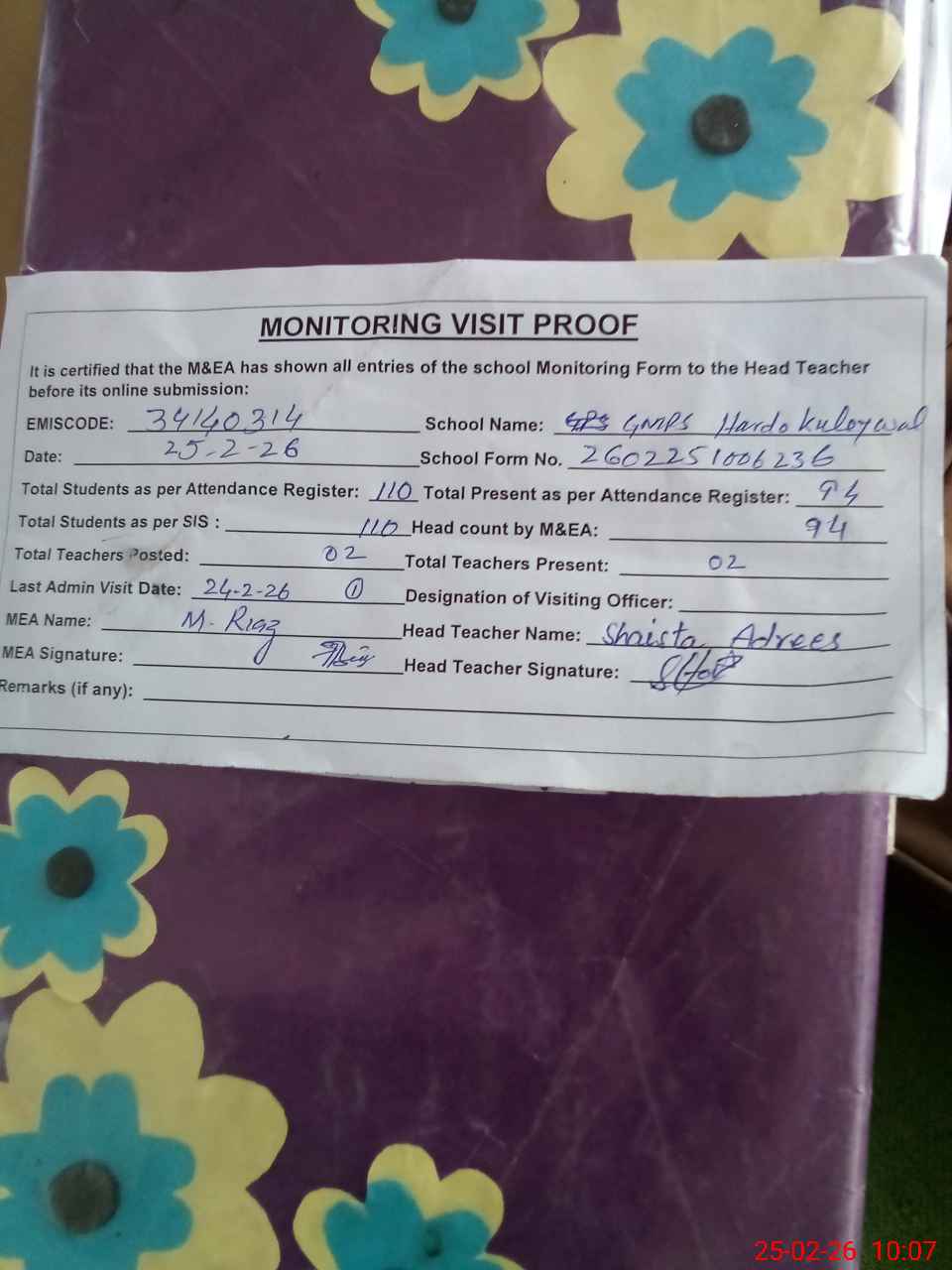 | Attendance Register | Head Teacher | MEA with School | Visit Proof |