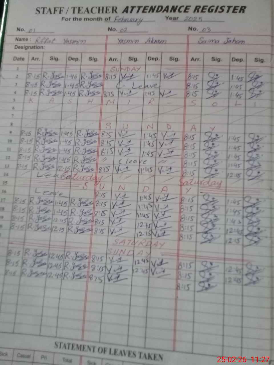 | CNIC | Full Name | Designation | R/C | Absence During Last Calender Month |