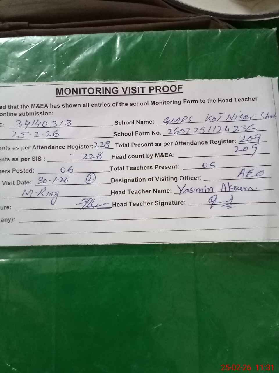 | Attendance Register | Head Teacher | MEA with School | Visit Proof |