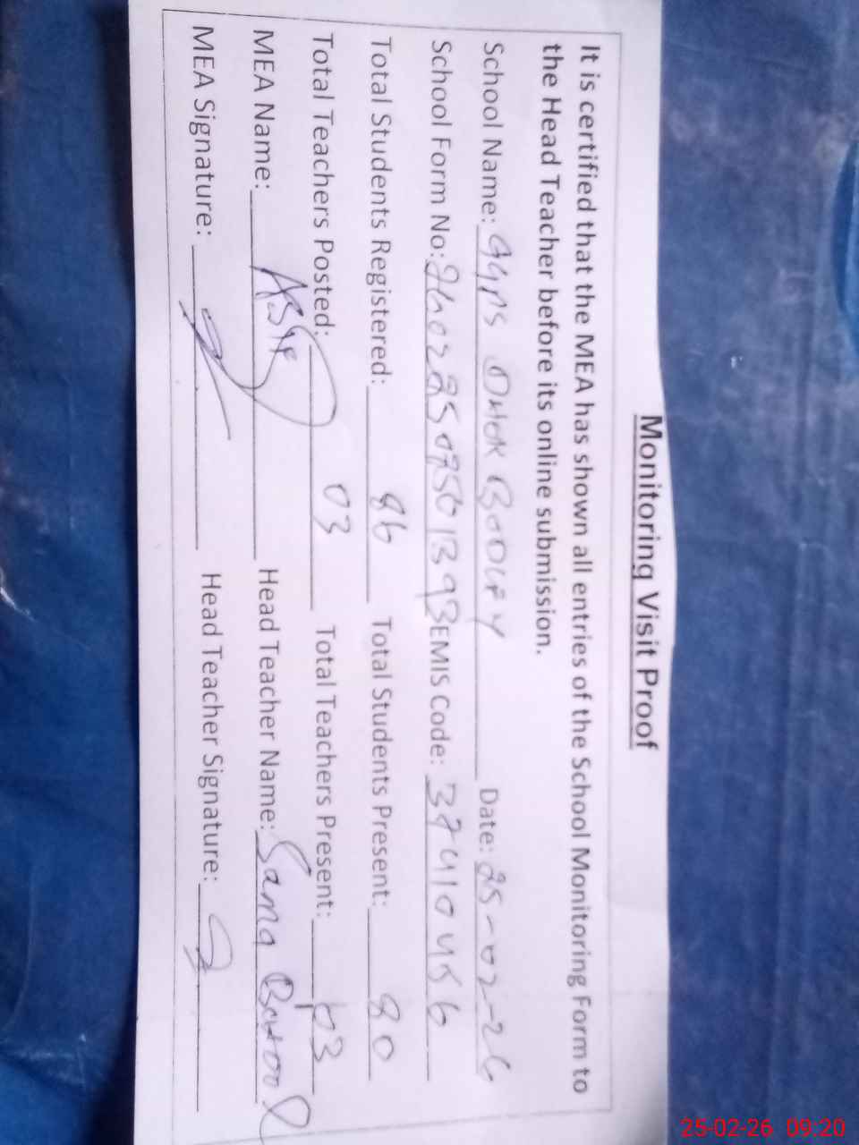 | Attendance Register | Head Teacher | MEA with School | Visit Proof |