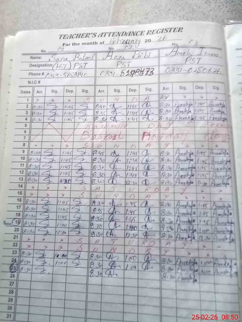 | Name: Sa**** Ba**** Designation: (School Headmaster's/Headmistress's) HEADMISTRESS Phone/Cell Number: 03**** |