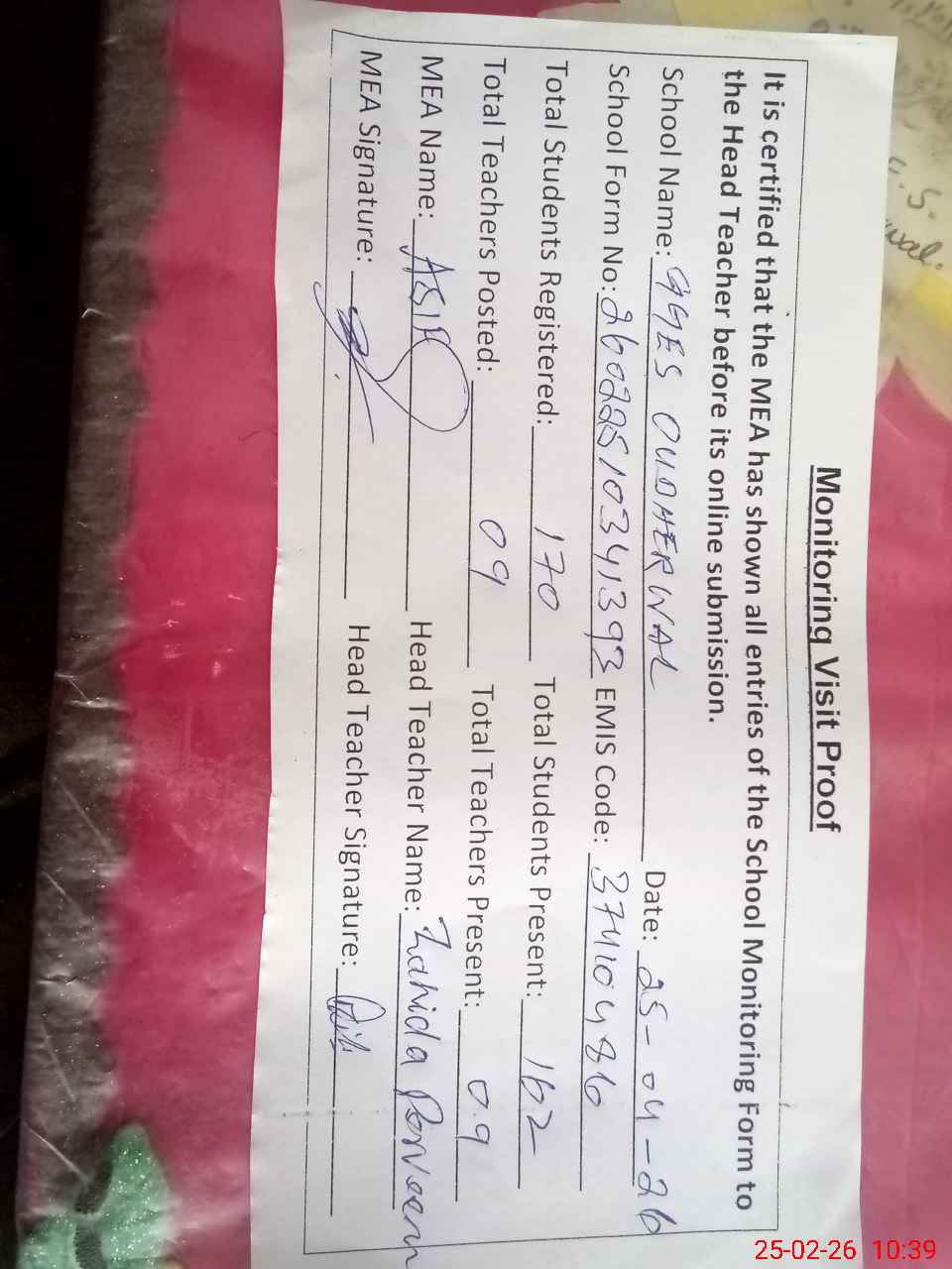 | Certified that this School was Inspected by the Undersigned MEA/DMO Today and the Information Stated Above is as Per Record. | |||||