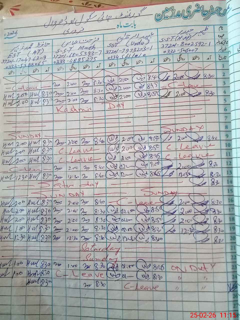 | CNIC | Full Name | Designation | R/C | Absence During Last Calender Month |