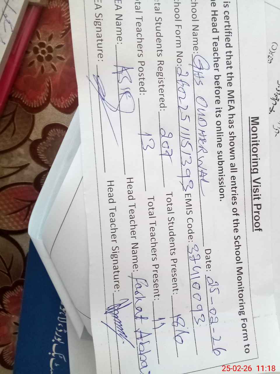 | Attendance Register | Head Teacher | MEA with School | Visit Proof |