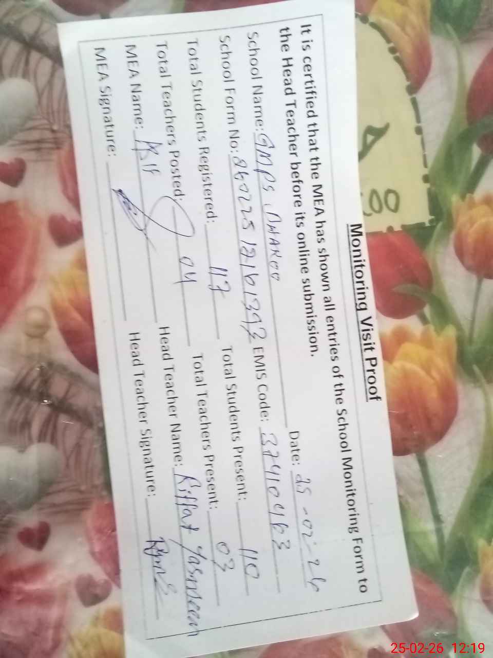| Certified that this School was Inspected by the Undersigned MEA/DMO Today and the Information Stated Above is as Per Record. | |||||