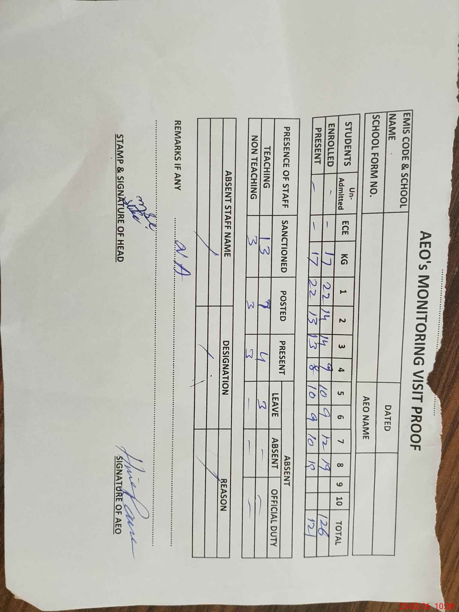 | Attendance Register | Head Teacher | MEA with School | Visit Proof |