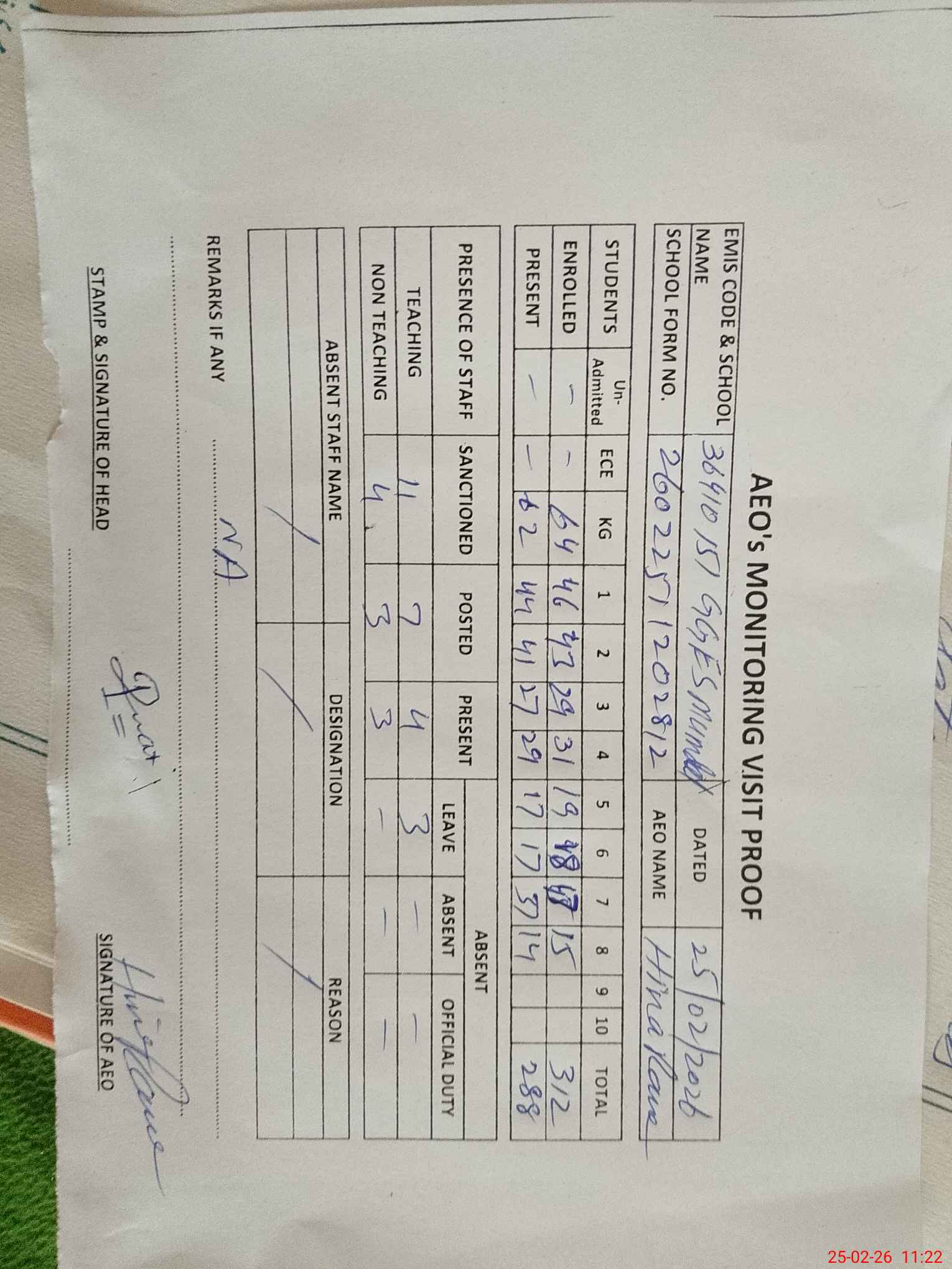 | Attendance Register | Head Teacher | MEA with School | Visit Proof |