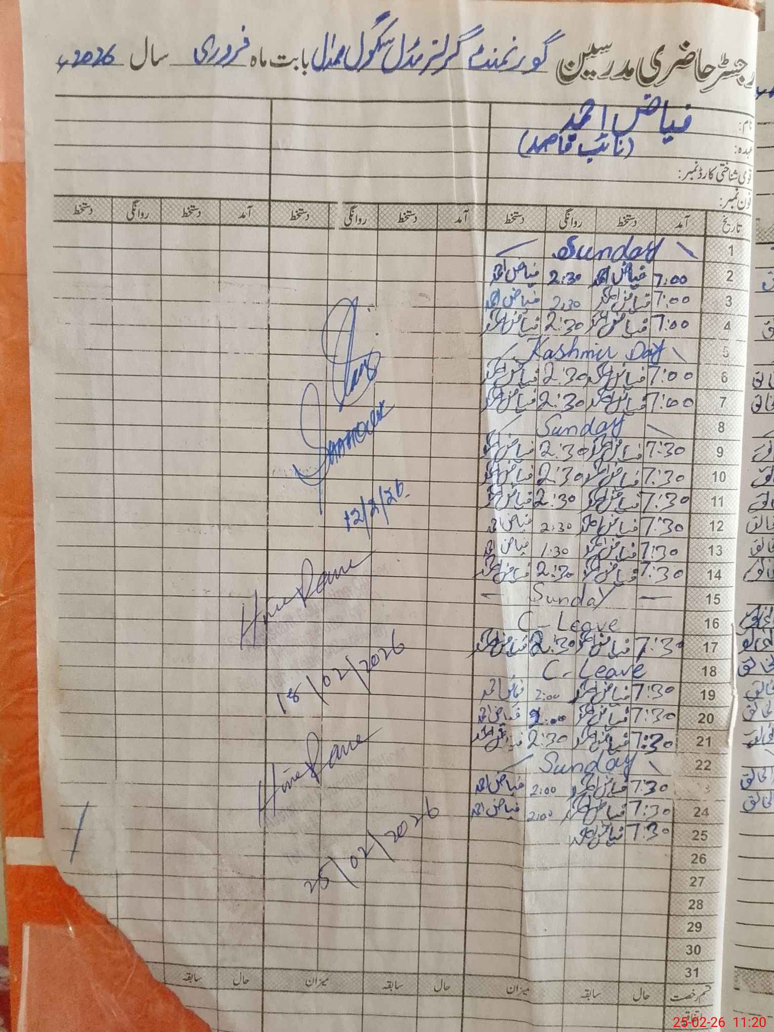 | CNIC | Full Name | Designation | R/C | Absence During Last Calender Month |