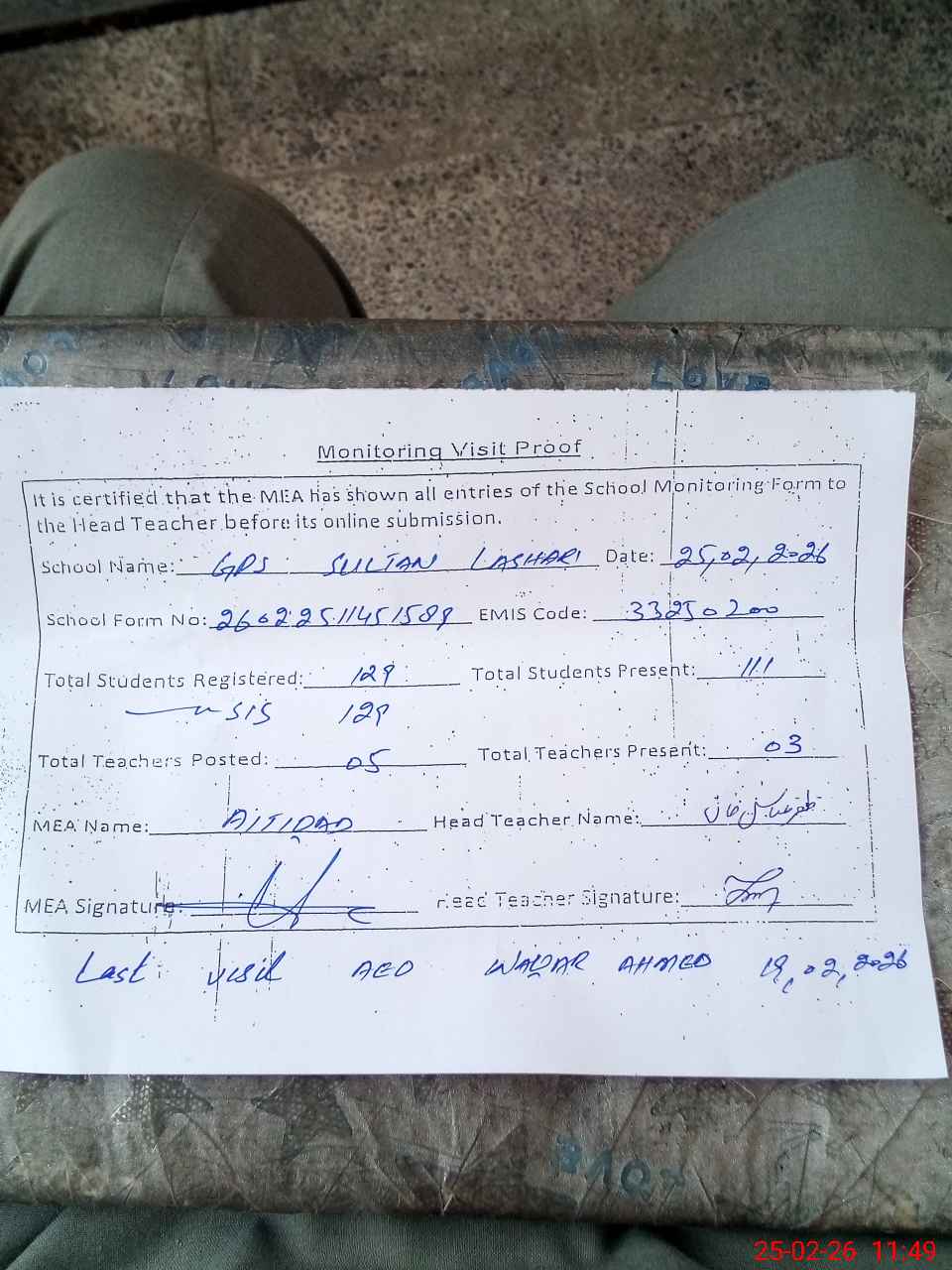 | Attendance Register | Head Teacher | MEA with School | Visit Proof |