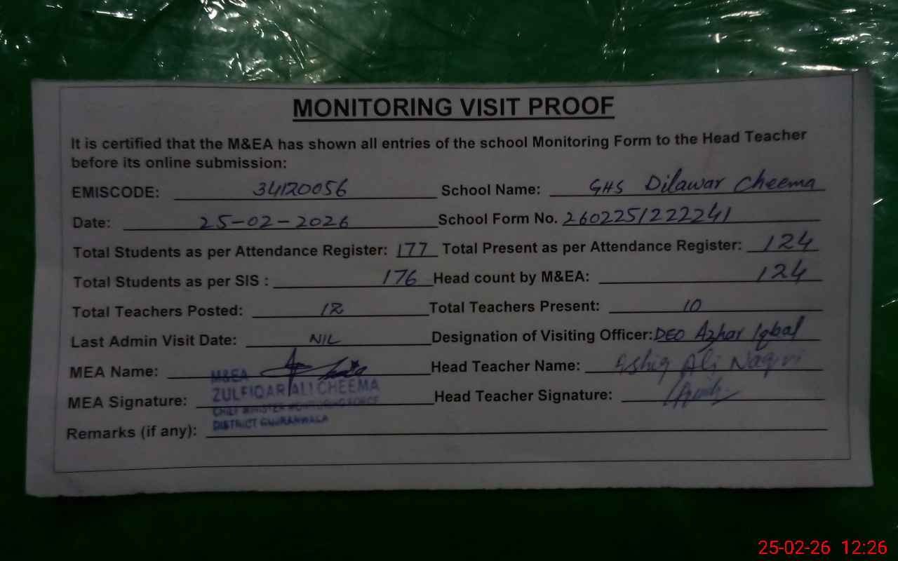 | EMIS Code: 34120056 | Name of School: GHS DILAWAR CHEEMA | |||