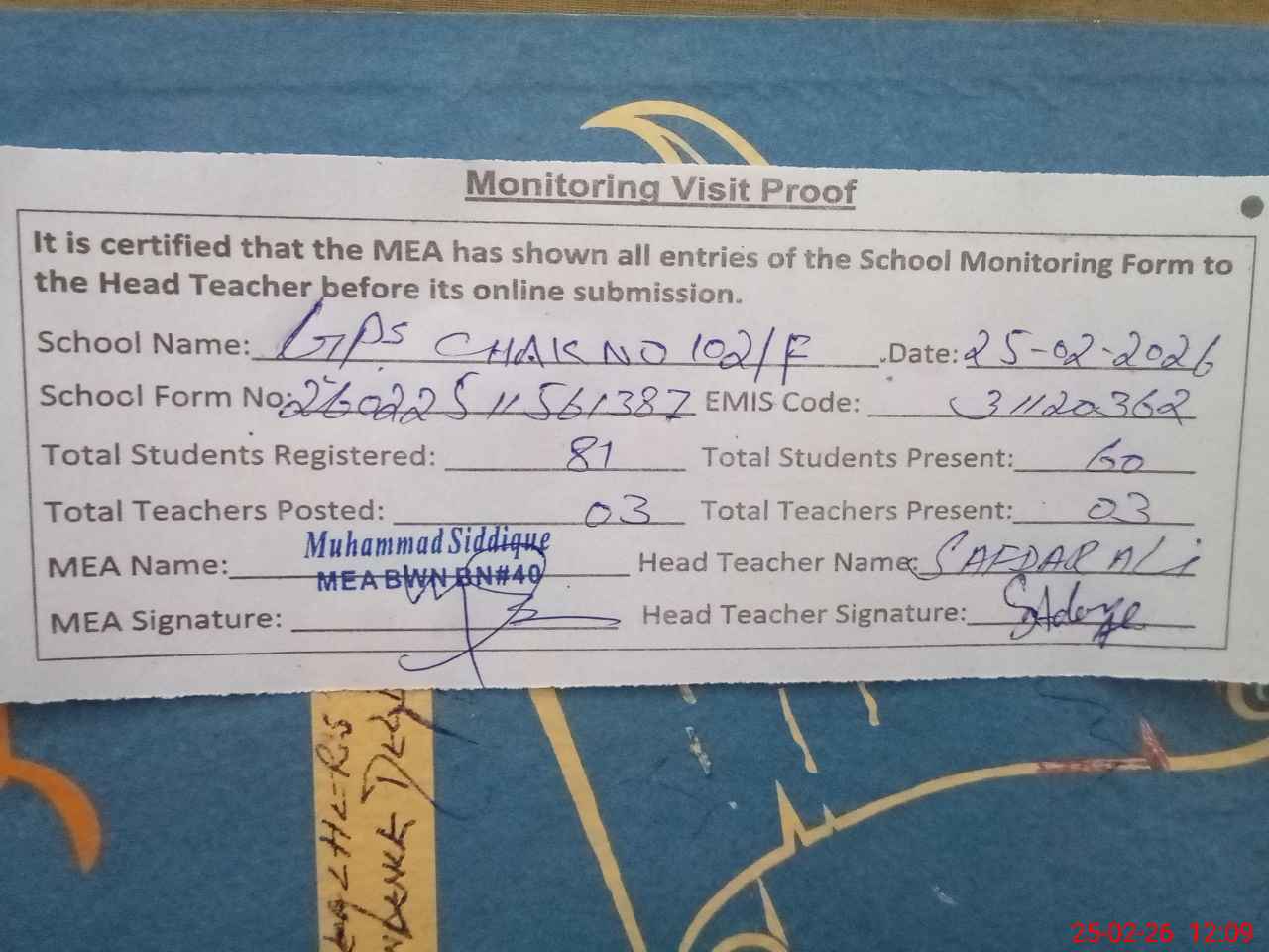 | EMIS Code: 31120362 | Name of School: GPS CHAK NO 102 F | |||