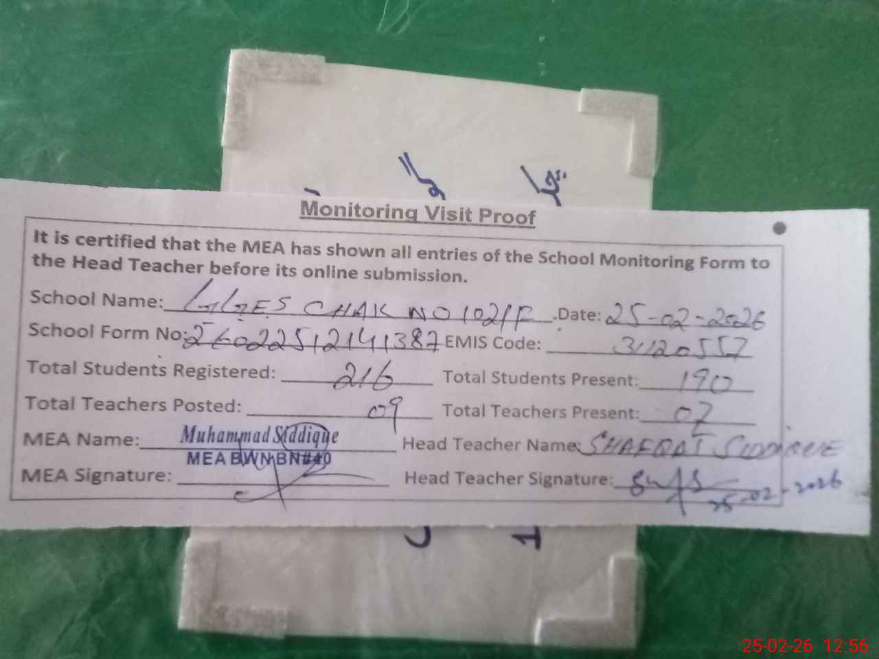 | Attendance Register | Head Teacher | MEA with School | Visit Proof |