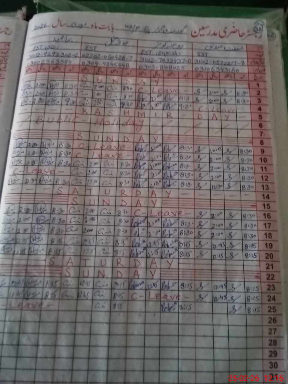 | CNIC | Full Name | Designation | R/C | Absence During Last Calender Month |