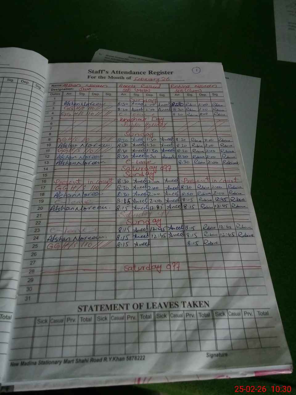 | CNIC | Full Name | Designation | R/C | Absence During Last Calender Month |