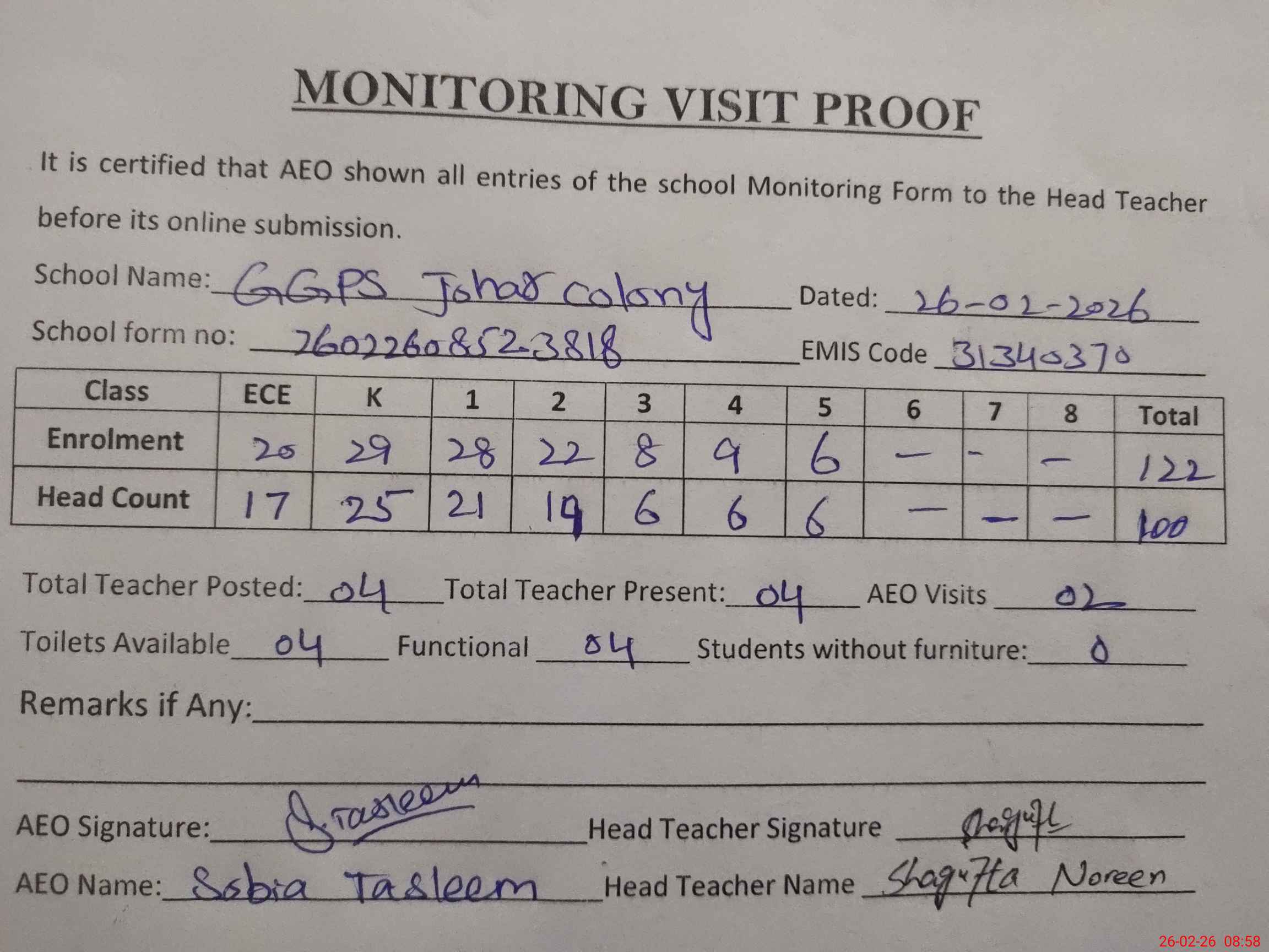 | Attendance Register | Head Teacher | MEA with School | Visit Proof |