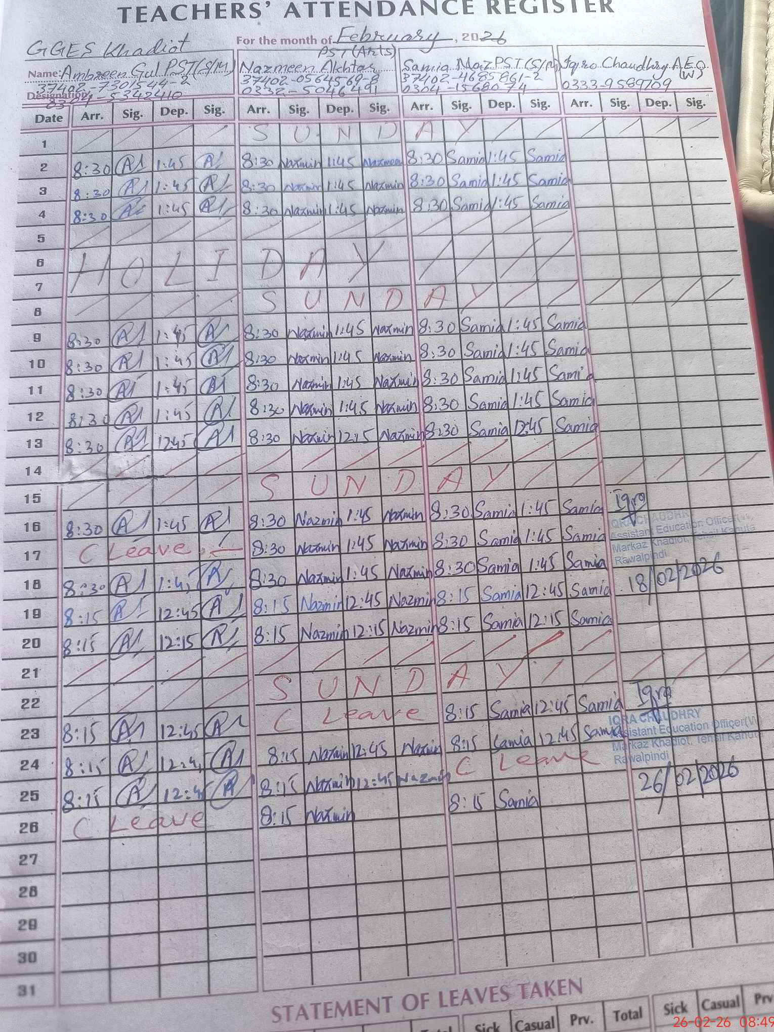 | 37**** | Sa**** Bi**** | EST (Math) | Regular | 0 | 0 | 0 | 0 | 0 | 0 | 0 | 0 | 0 | Absent (Un-Authorized) |
