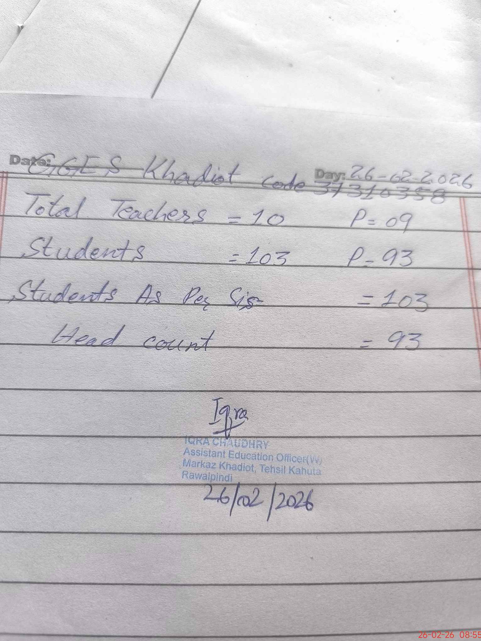| District: RAWALPINDI | Tehsil: KAHUTA | Markaz: KHADIOT - FEMALE | Level: Middle | |