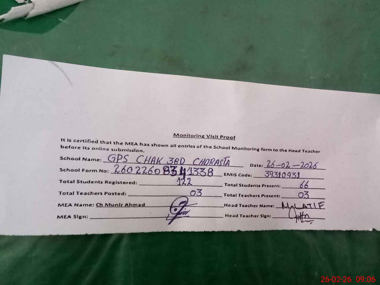 | EMIS Code: 39310931 | Name of School: GPS CHAK 38-D CHORASTA | |||