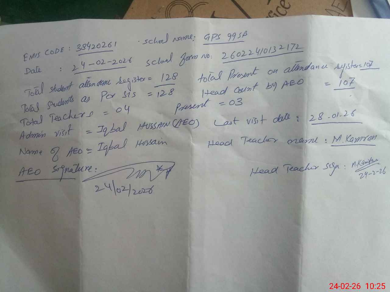 | Attendance Register | Head Teacher | MEA with School | Visit Proof |