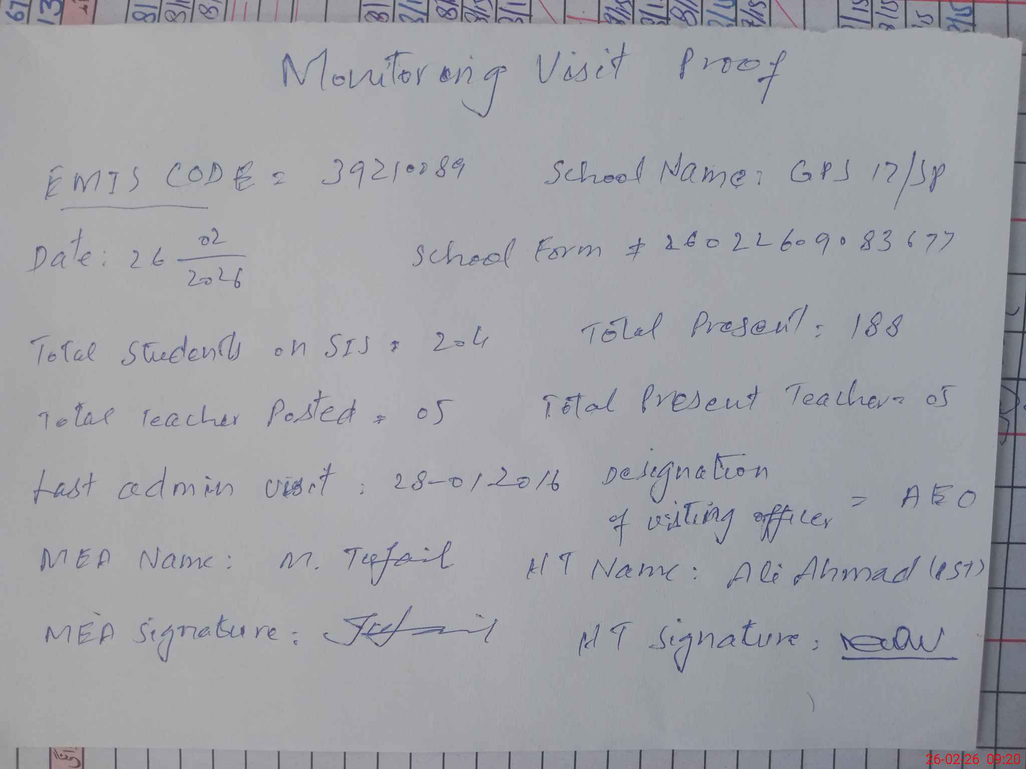 | EMIS Code: 39210089 | Name of School: GPS 17/SP P.O PAKPATTAN | |||