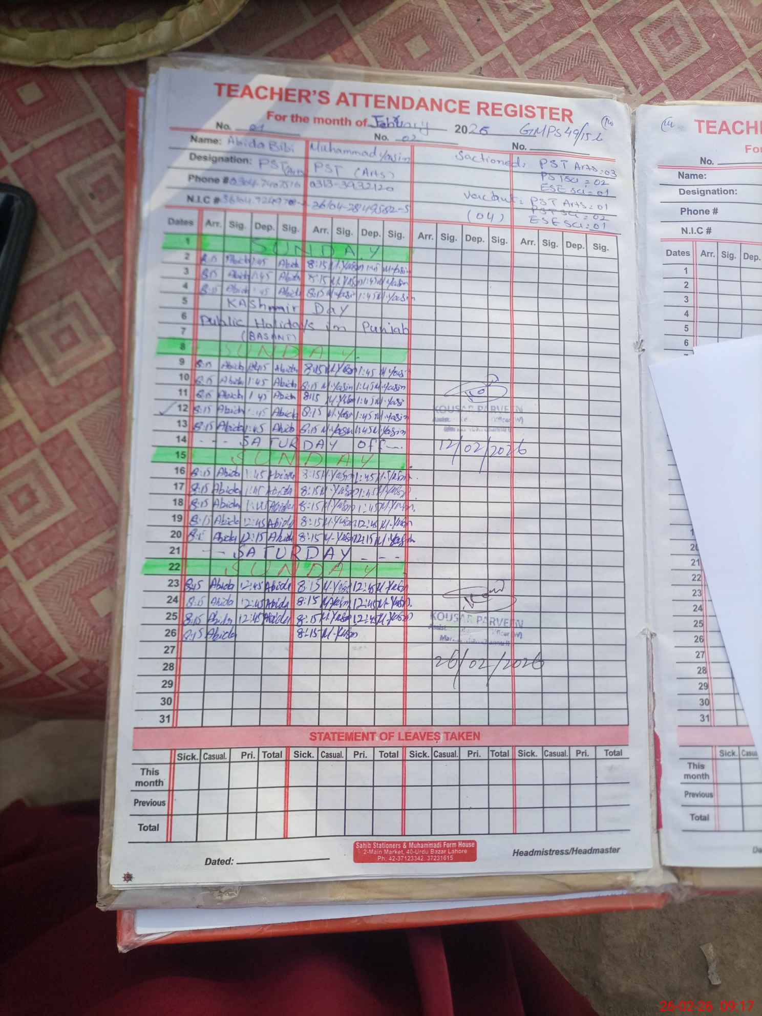 | Name: Ab**** Bi**** Designation: (School Headmaster's/Headmistress's) ESE (Arts) Phone/Cell Number: 03**** |