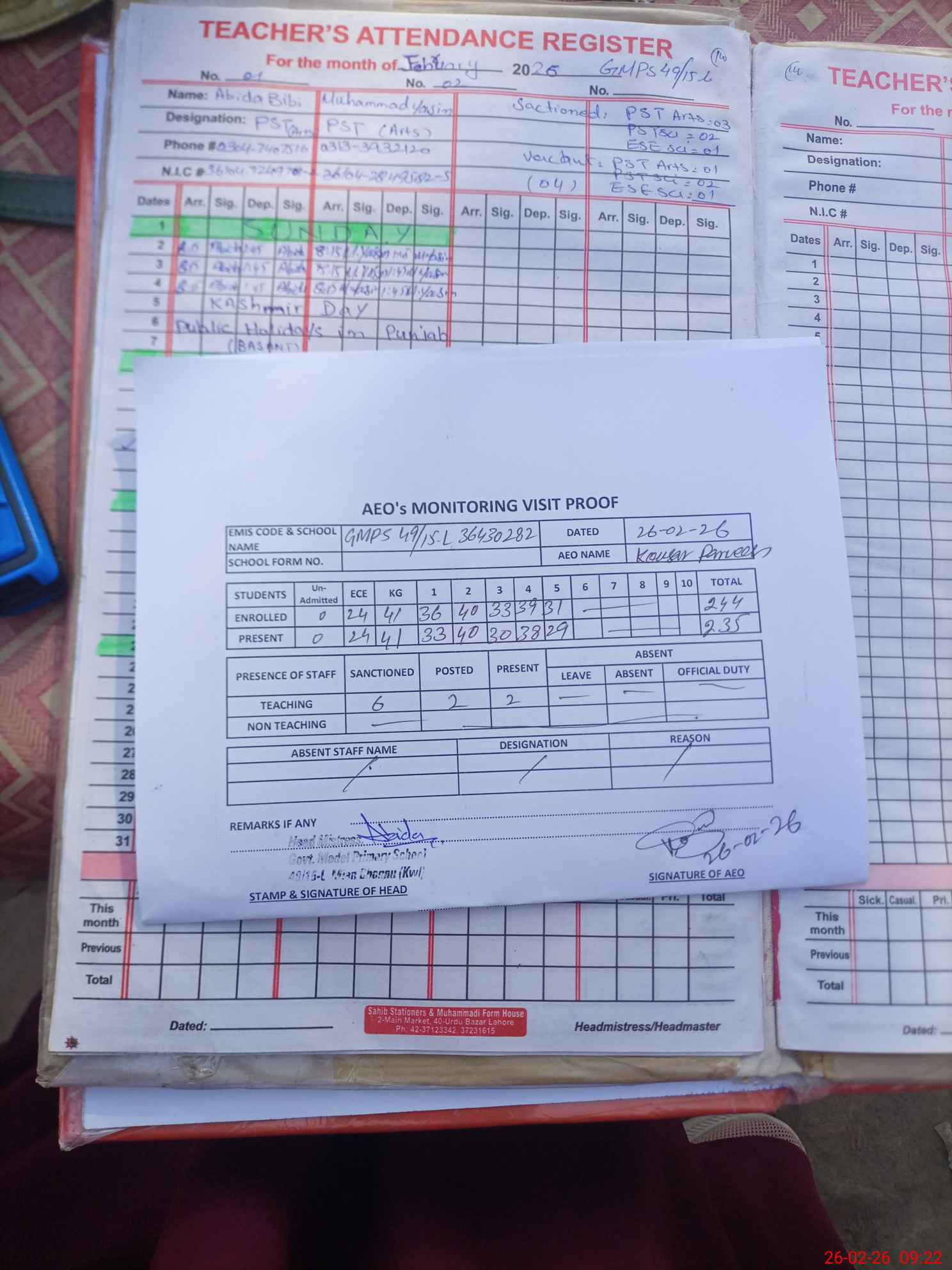| Attendance Register | Head Teacher | MEA with School | Visit Proof |