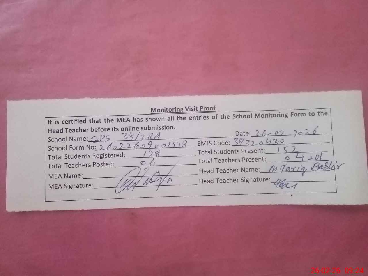 | Attendance Register | Head Teacher | MEA with School | Visit Proof |