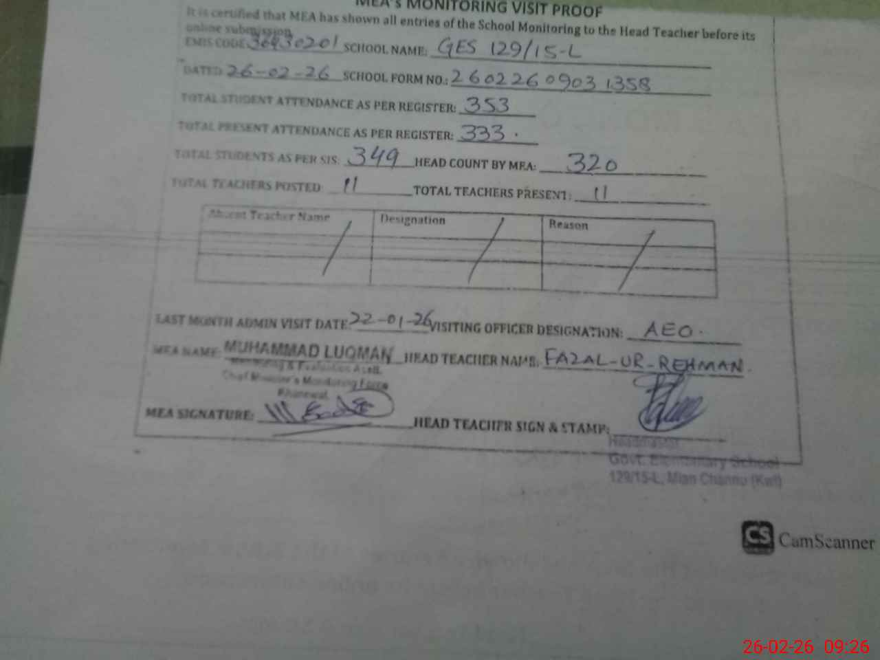 | Attendance Register | Head Teacher | MEA with School | Visit Proof |