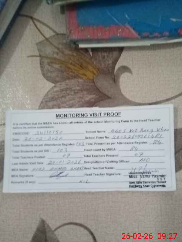 | EMIS Code: 34110150 | Name of School: GGES KOT BARY KHAN | |||
