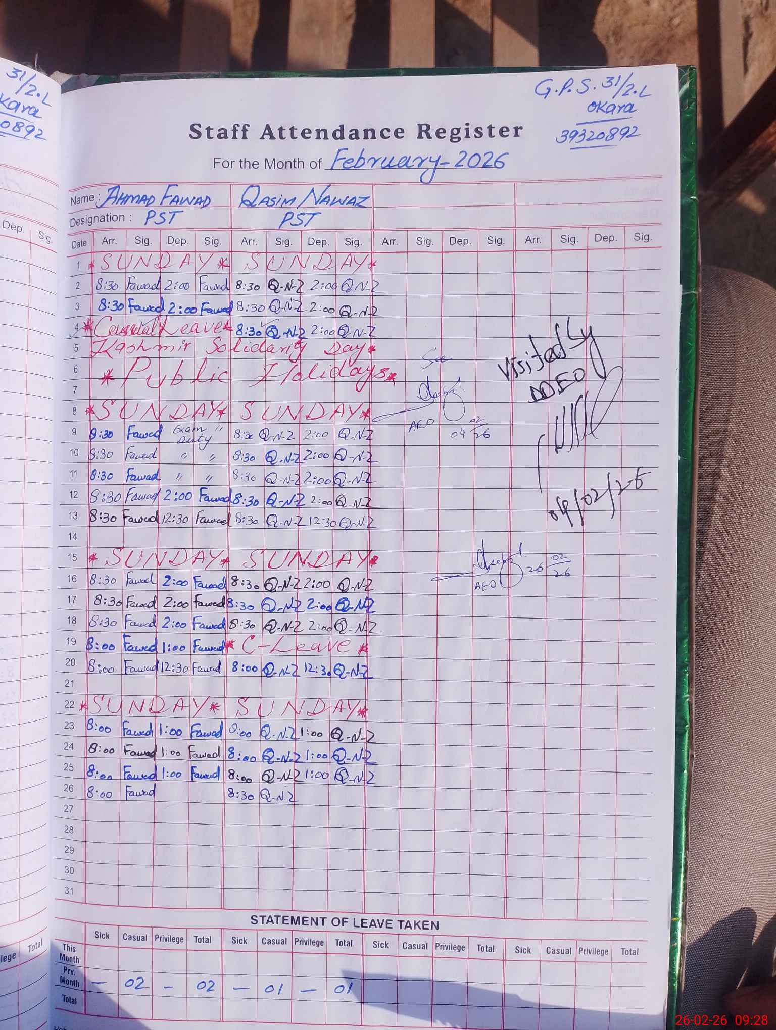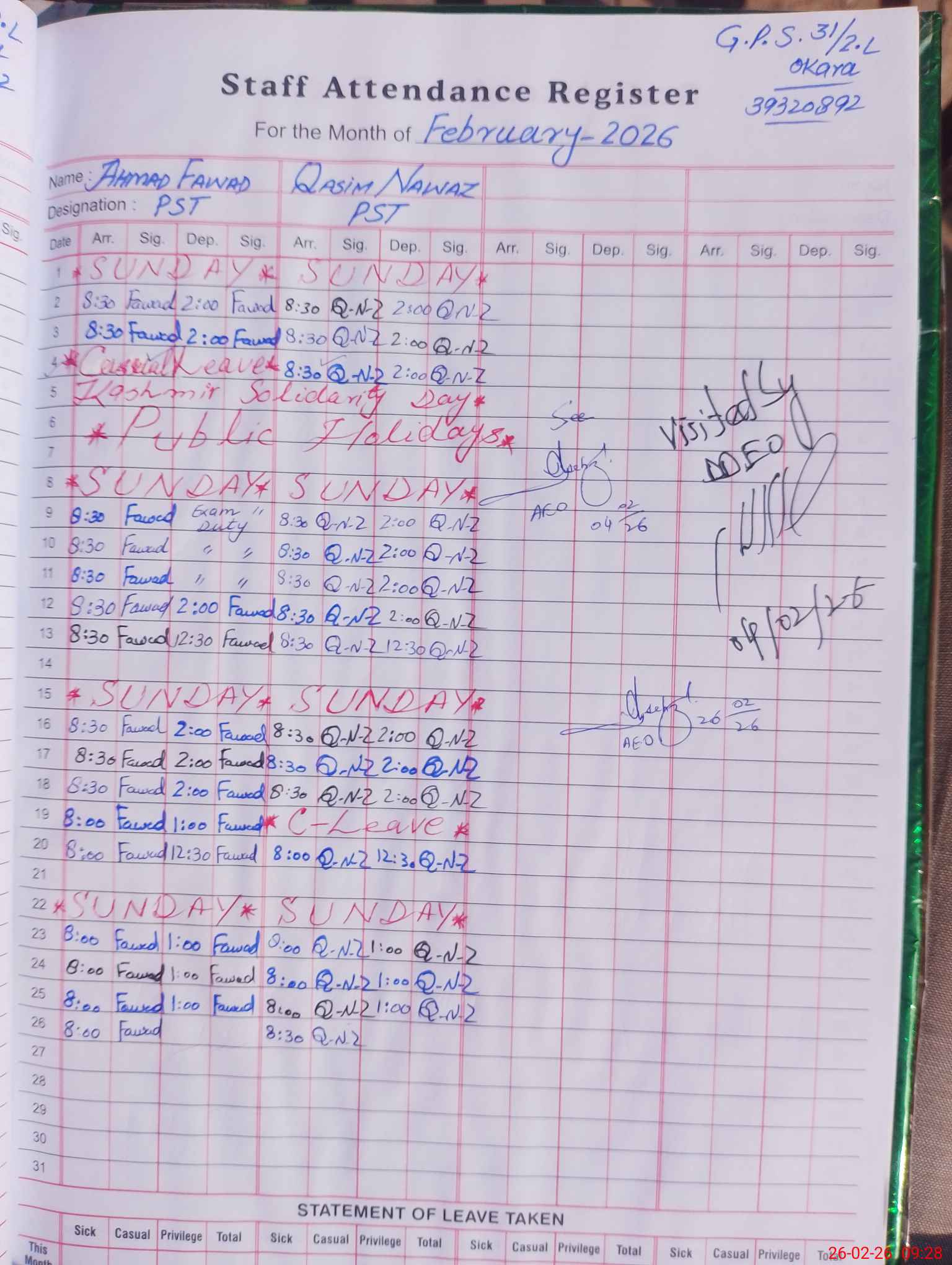 | Name of AEO: | AEO Contact No.: | MEA Phone#: 03**** | ||