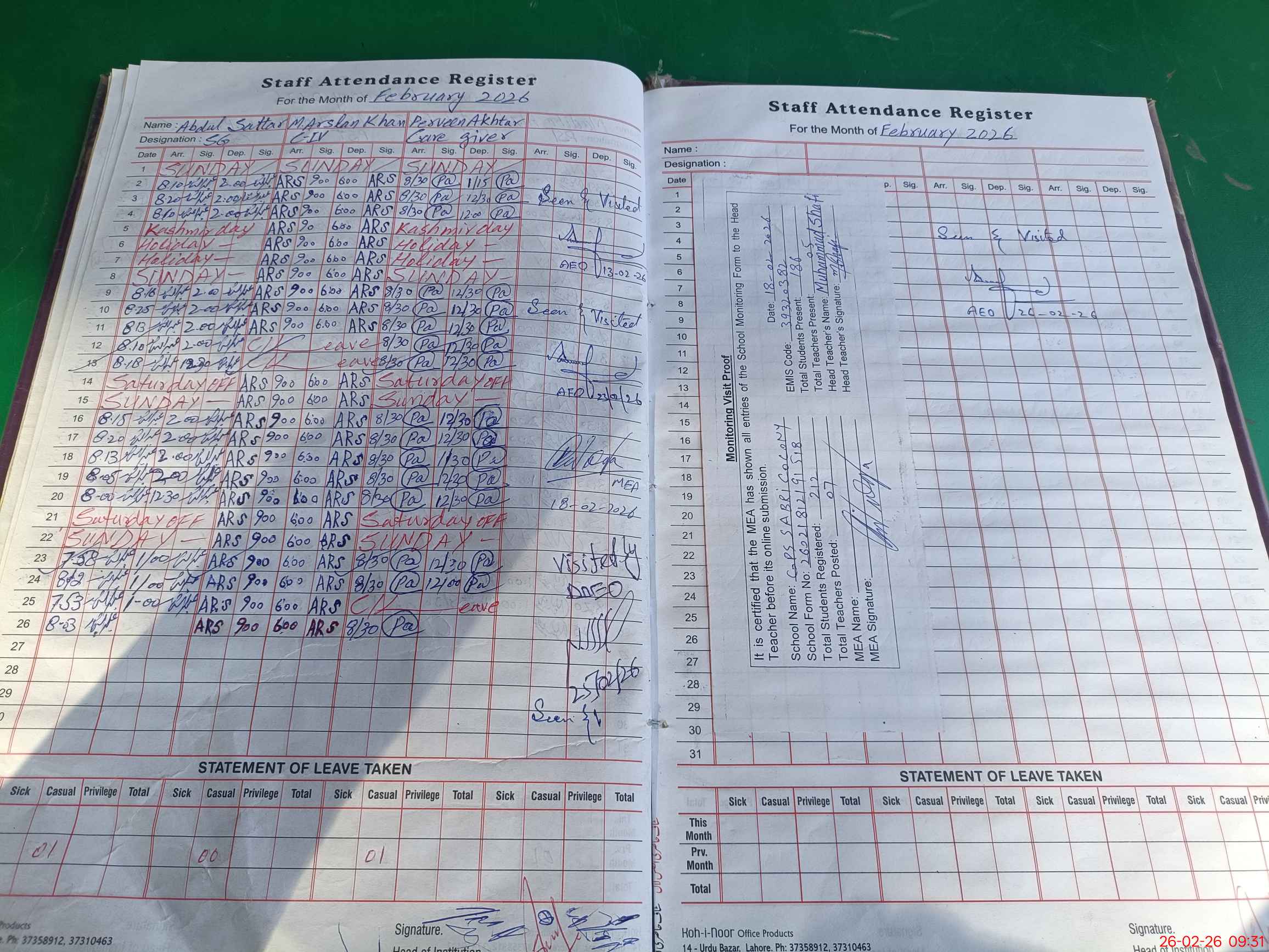 | Attendance Register | Head Teacher | MEA with School | Visit Proof |