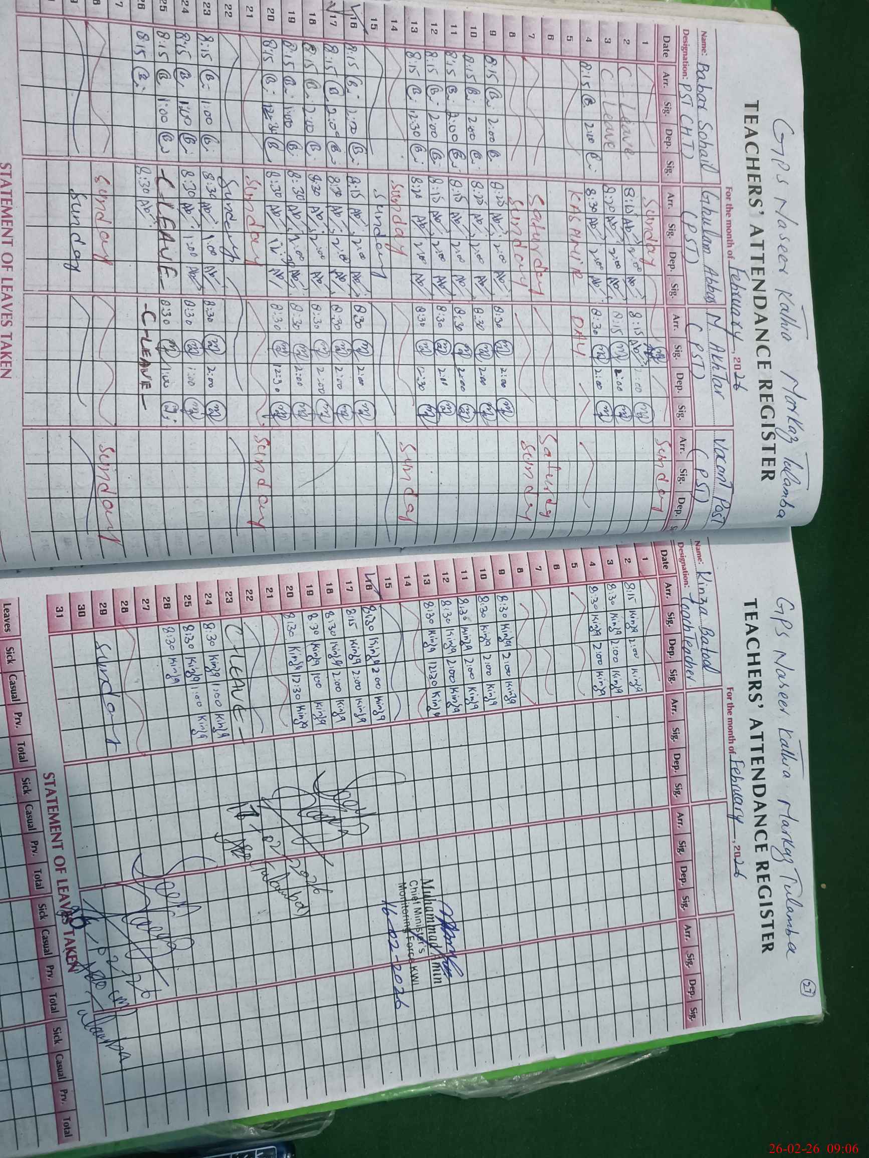 | Monitoring Date: 26-02-2026 | Start Time: 26-02-2026 08:49 AM | End Time: 26-02-2026 09:11 AM | Name of MEA: Ab**** Ha**** | |