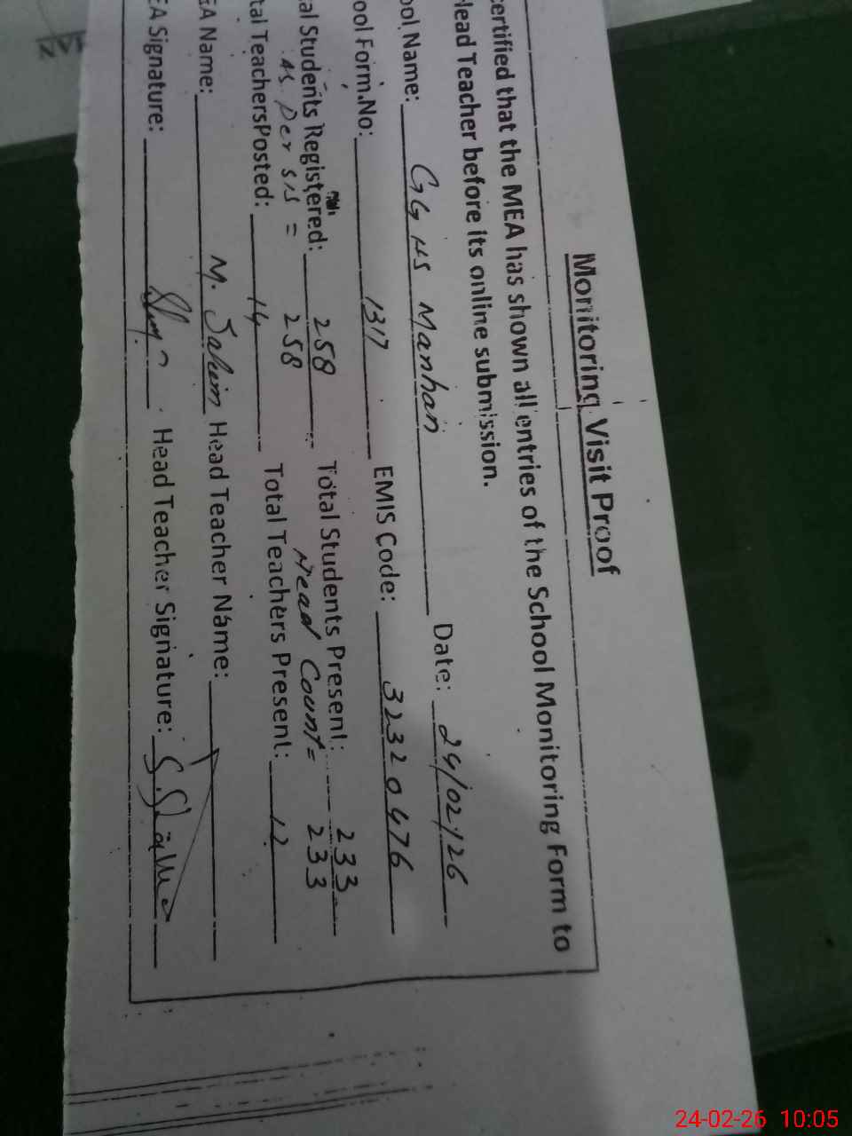 | EMIS Code: 32320476 | Name of School: GGHS MANHAN (ARAIN WALA) | |||